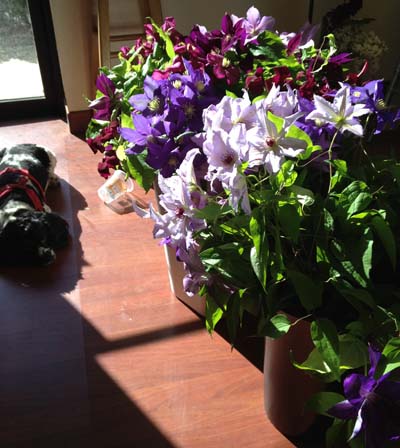 The clematis came packed very nicely, no blooms were squished. I immediately conditioned them – fresh cuts on the stems, lukewarm water and flower food. Here they are hydrating: